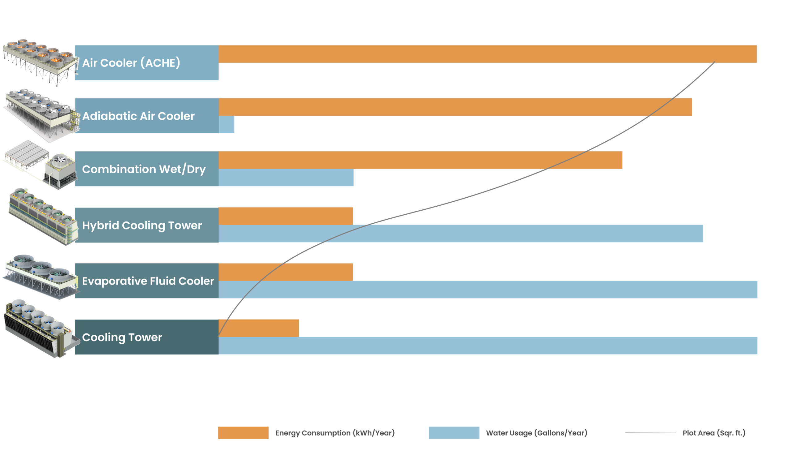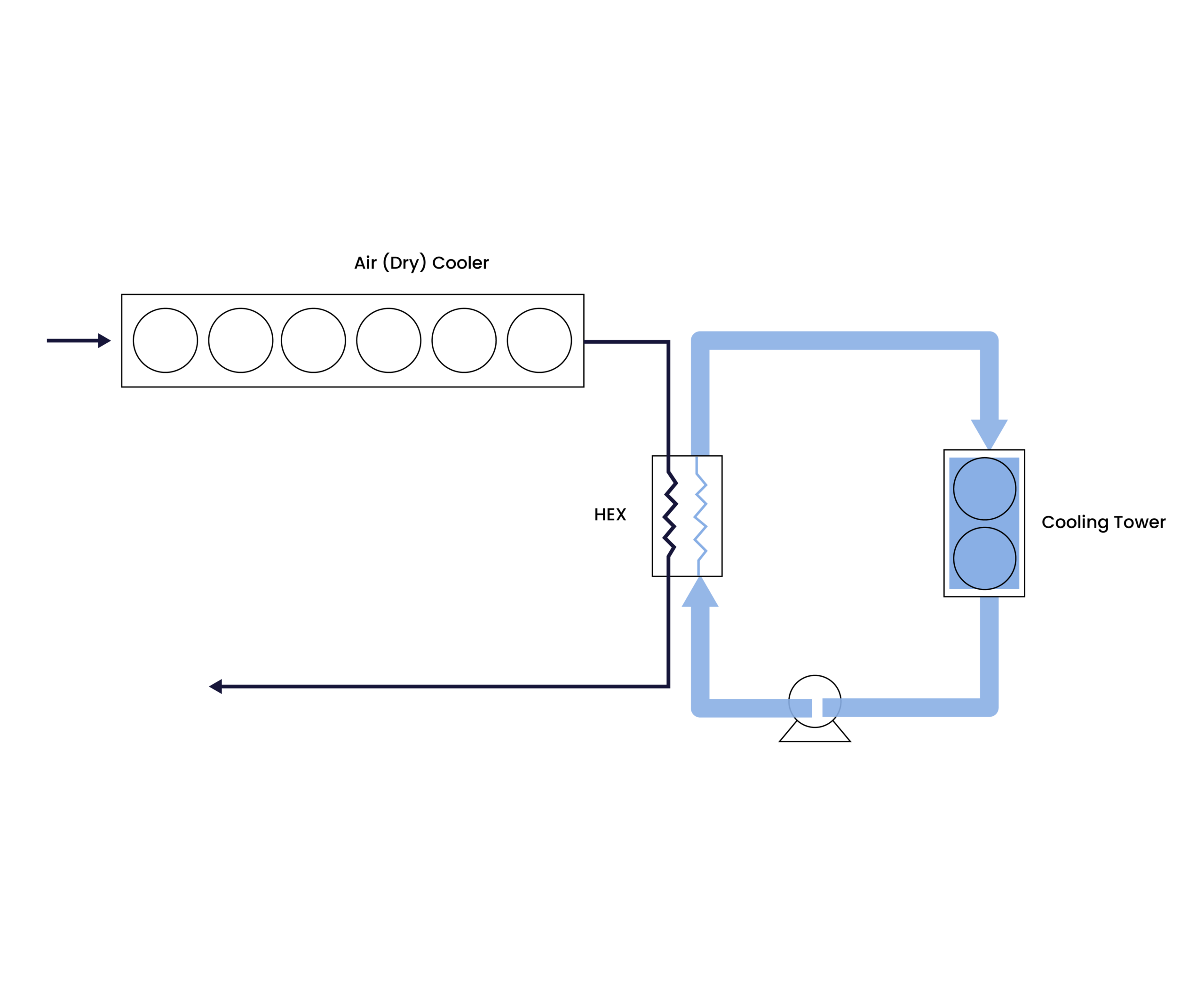 A cooling tower and an air cooled heat exchanger (ACHE ) can be arranged in series or parallel to reduce water consumption while still meeting the cooling requirements.