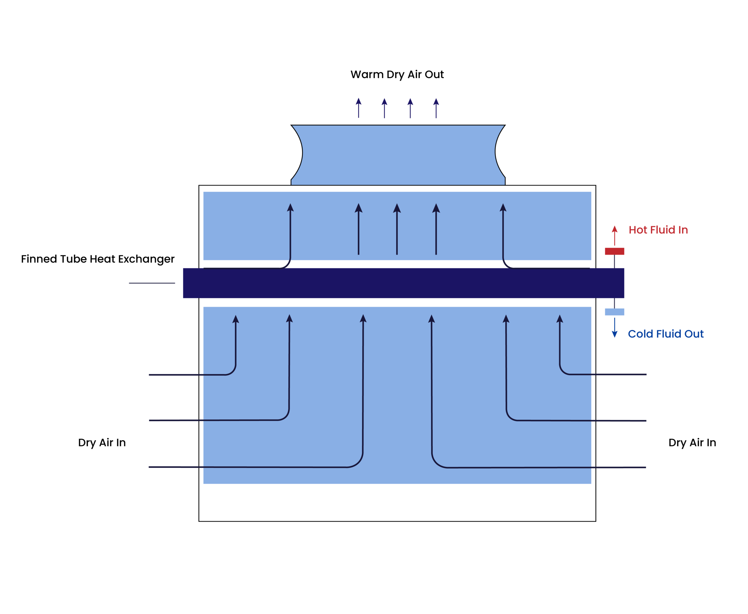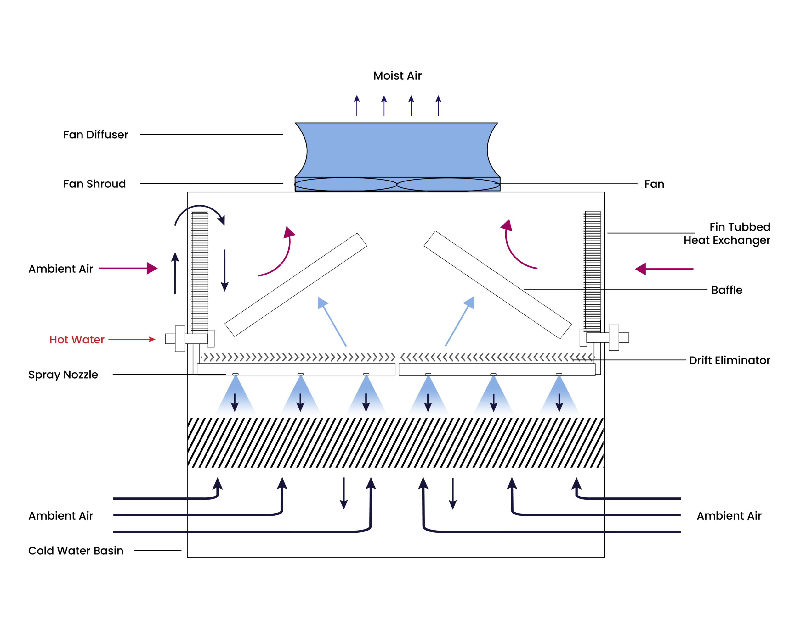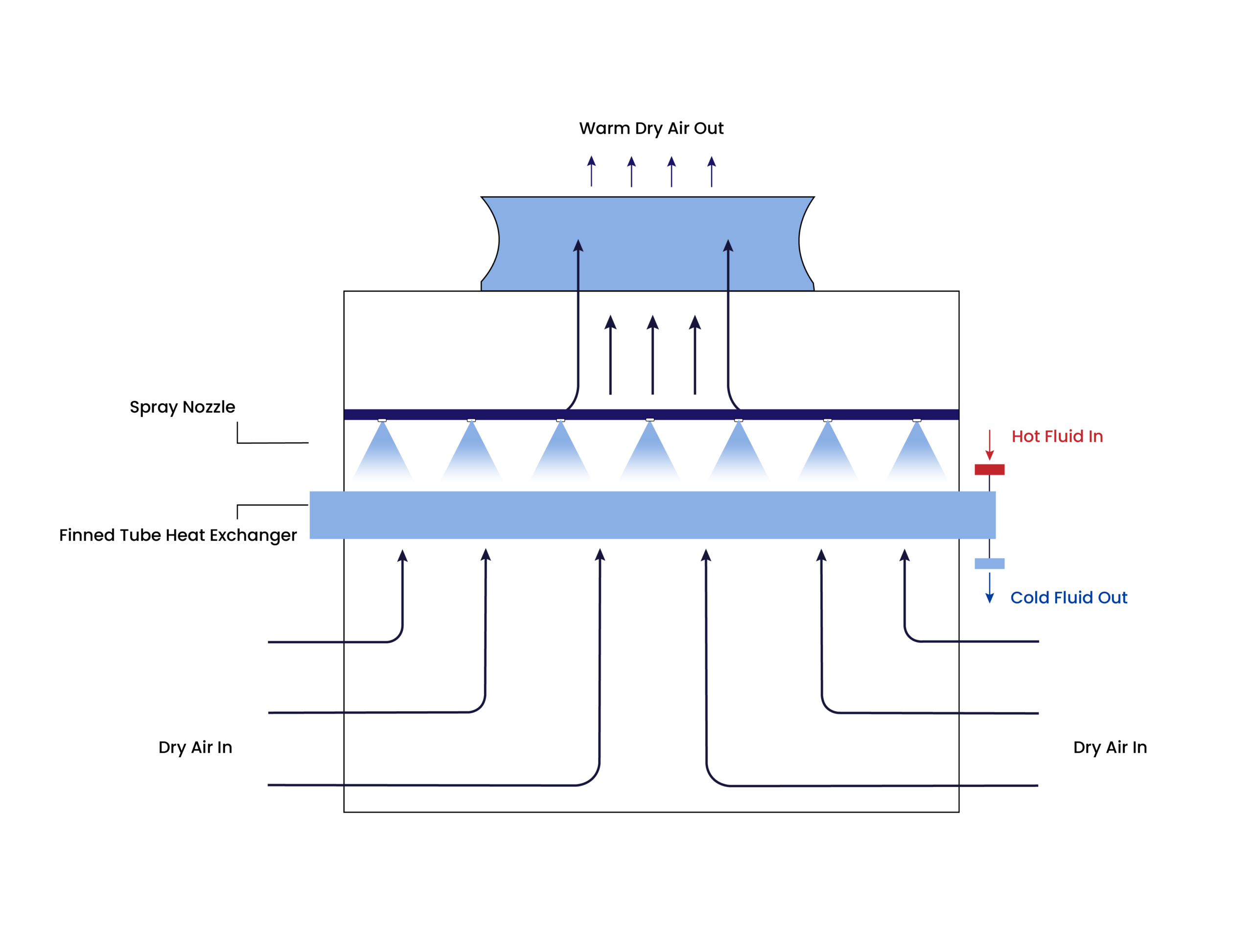 An adiabatic dry cooler primarily functions as a an Air Cooled Heat Exchanger (ACHE), using fans to draw ambient air across a finned heat exchanger coil.